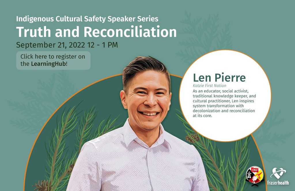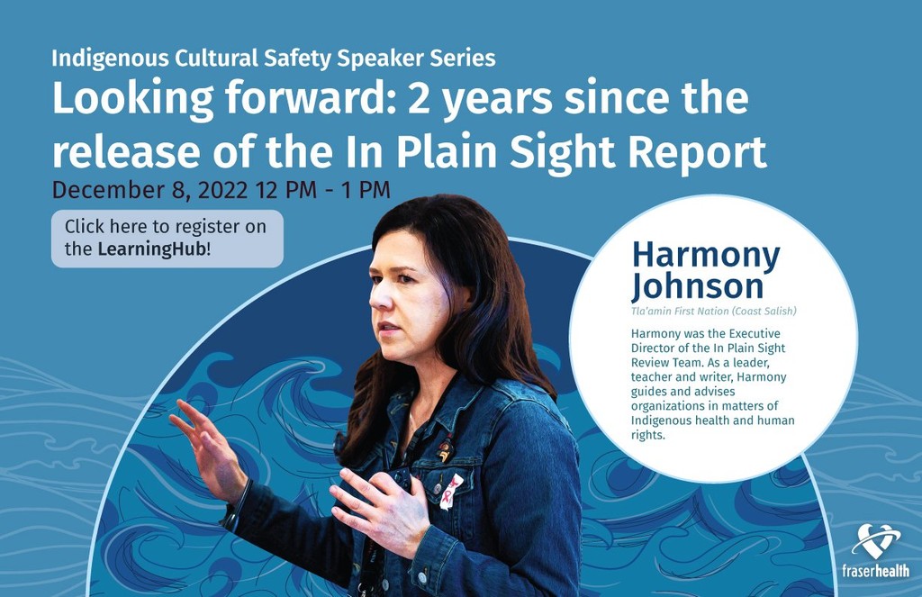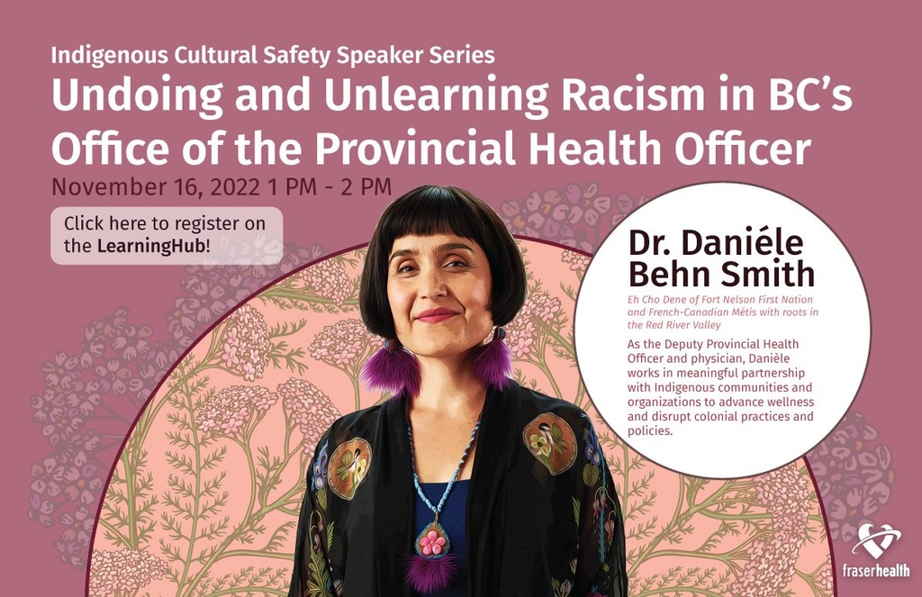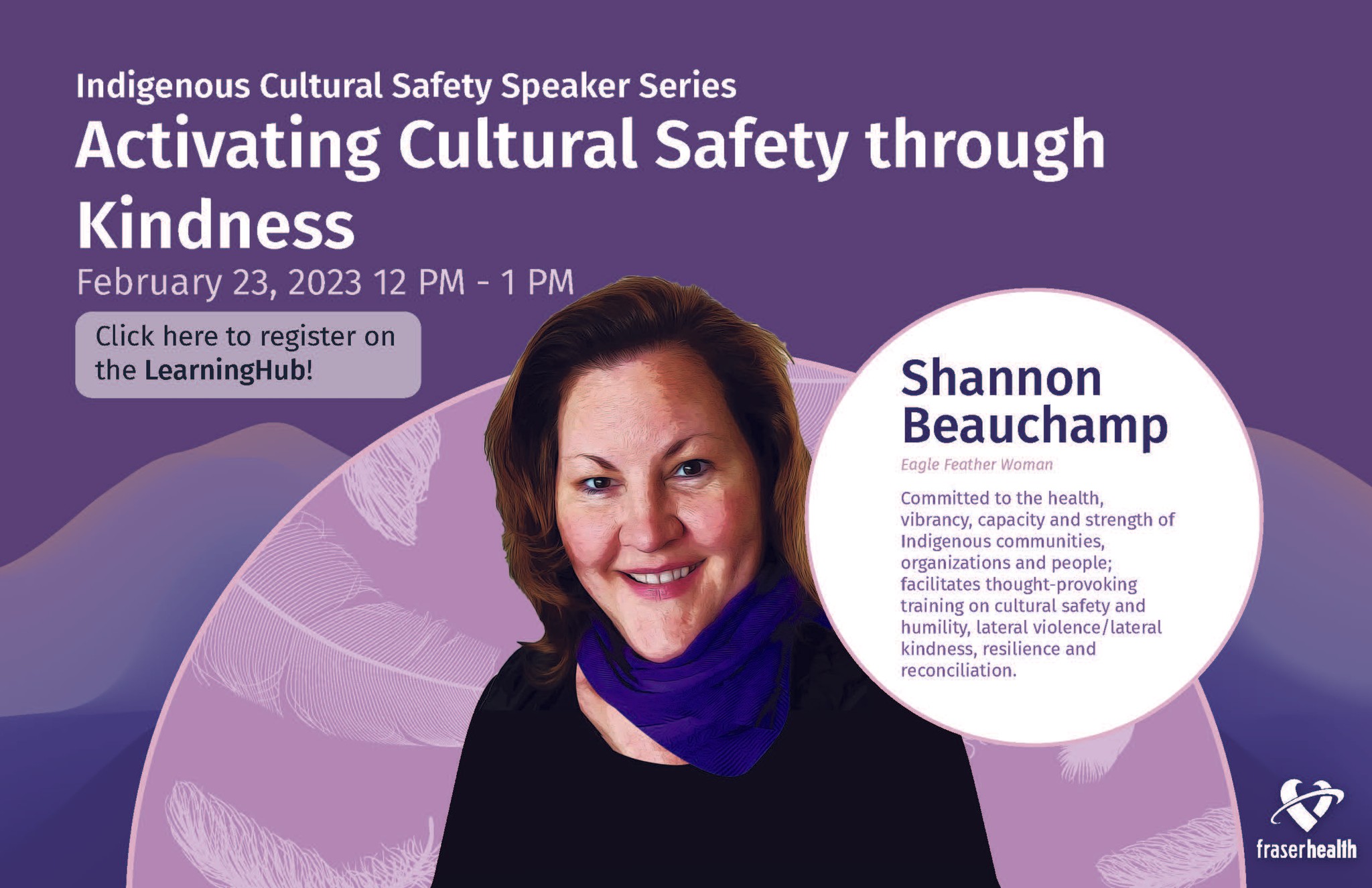 The Indigenous Cultural Safety Speaker Series runs monthly from September to March. It features five Indigenous leaders and educators who share their knowledge on key health-related topics. Aimed at Fraser Health and medical staff, the series encourages learning, reflection, and a renewed commitment to Indigenous cultural safety and anti-racism.